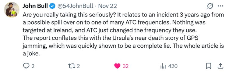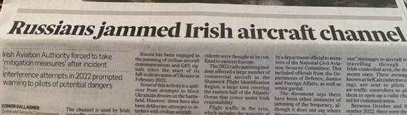 This Irish Times front-page “news” headline from 22nd Nov 2025 which screamed “Russians jammed Irish aircraft channel” really is a joke. In our secular and post-truth world we have had to get used to an increasingly dishonest media. Even though we are becoming more accustomed to swimming in a sea of lies and half-truths, this “news” is a joke, which should immediately alert us to the fact that this story is part of a psyop.