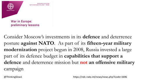 Importantly the NATO Defence College’s (NATO DC) own analysis clearly states that during Russia’s fifteen-year military modernisation programme Russia invested in a defence and deterrence capability of its armed forces, NOT in their offensive capability. Indeed, NATO DC used this fact to explain why Russia did badly at the beginning of its Ukraine campaign, which strongly suggests that they never intended to invade that country.
