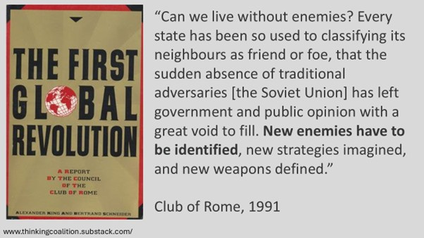 In terms of item 5, the Club of Rome explicitly stated that “new enemies have to be identified” at the time when the threat from the Soviet Union was evaporating in 1991.