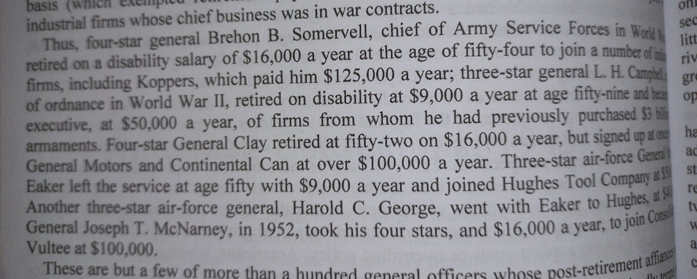 We saw the grotesque revolving door between Big Pharma and government that operated during the COVID scam, whereby all of the key government advisers were ex-Big Pharma executives, some with unvested stock option schemes. I don’t know if anyone has done a recent study on the revolving door between MoD and defence contractors, but Carroll Quigley covered this in his magnum opus, Tragedy and Hope (1996). Below is the paragraph in which he identified a list of U.S. military brass who took early retirement on army pensions in order to take up very well-paid jobs in the MIC. There is nothing to suggest that this is not still happening.