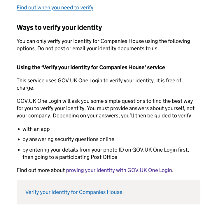 However, GOV UK guidance at today’s date currently states: “You can only verify your identity for Companies House using the following options (being OneLogin or the ACSP route). Do not post or email your identity documents to us.”