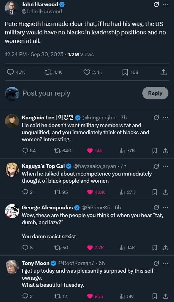 Of course this shit had become commonplace, feeding both ethnic resentment and middle and upper class white guilt. White liberals paid money to sit dutifully chortling while ‘comics’ like Noah trash talked their long dead great grandfathers, just as white liberals plastered Black Lives Matter flags on their lawns or, to get more up to the minute than Noah ever did, post in horror that Pete Hegseth asking for soldiers not to be obese and incompetent excludes blacks and women: