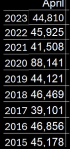 I want to highlight the “Midazolam” effect in April 2020 – here’s April 2020, compared to preceding and ensuing “Aprils”. From the tables of 9 years of monthly data.