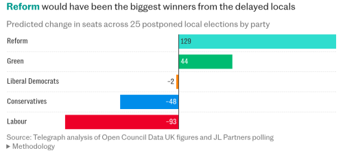 The poll by JL Partners, carried out for this newspaper, looked at 25 of the council areas where elections are set to be postponed. It found that Labour is trailing 11 points behind Reform and 4 points behind the Tories.