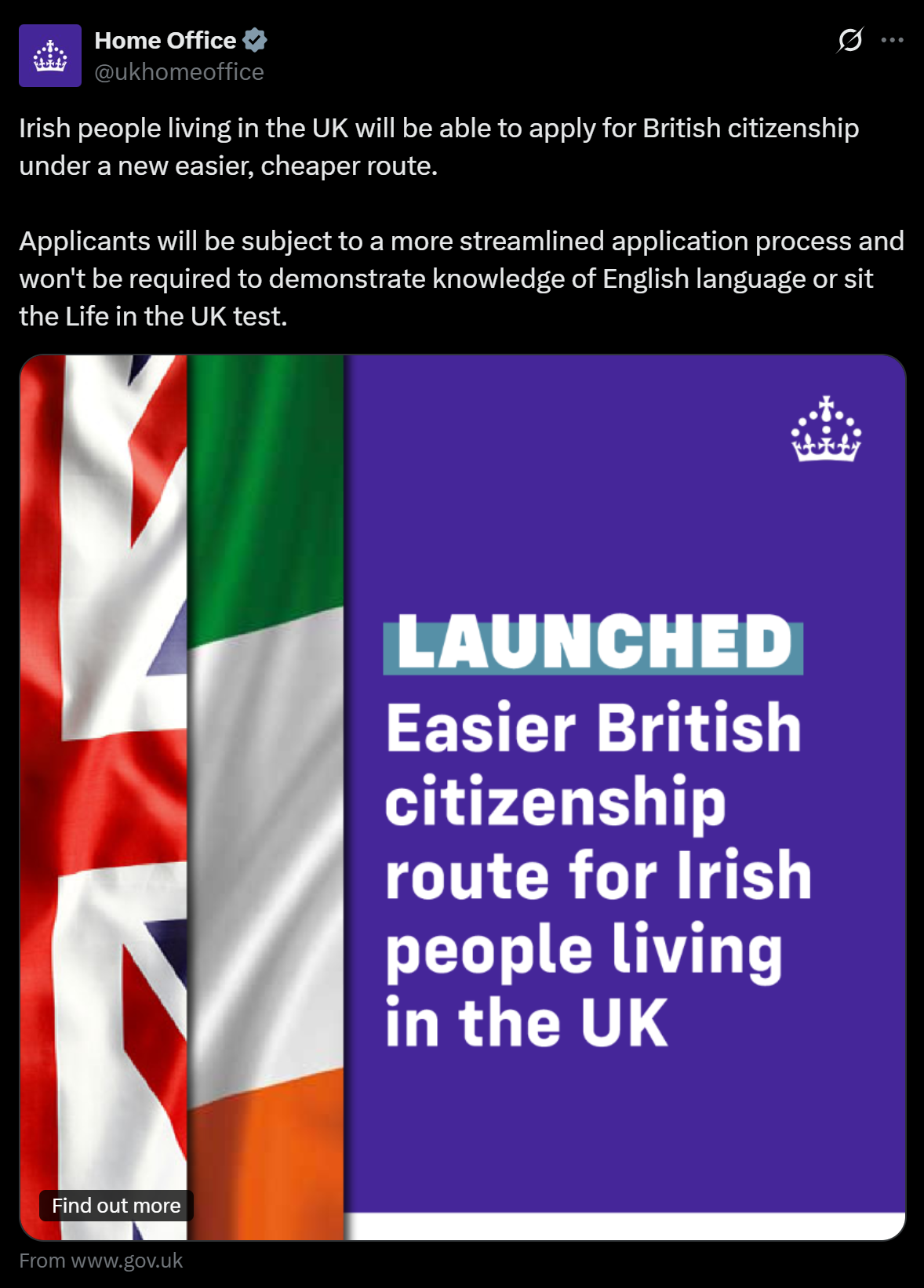 On 4 July 2025, the Home Office posted on X (Twitter) about a new British citizenship pathway for Irish citizens living in the UK, proudly noting that applicants won’t be required to demonstrate ‘knowledge of English language’ or sit the life in the UK test, both of which remain a requirement for all other nationalities.