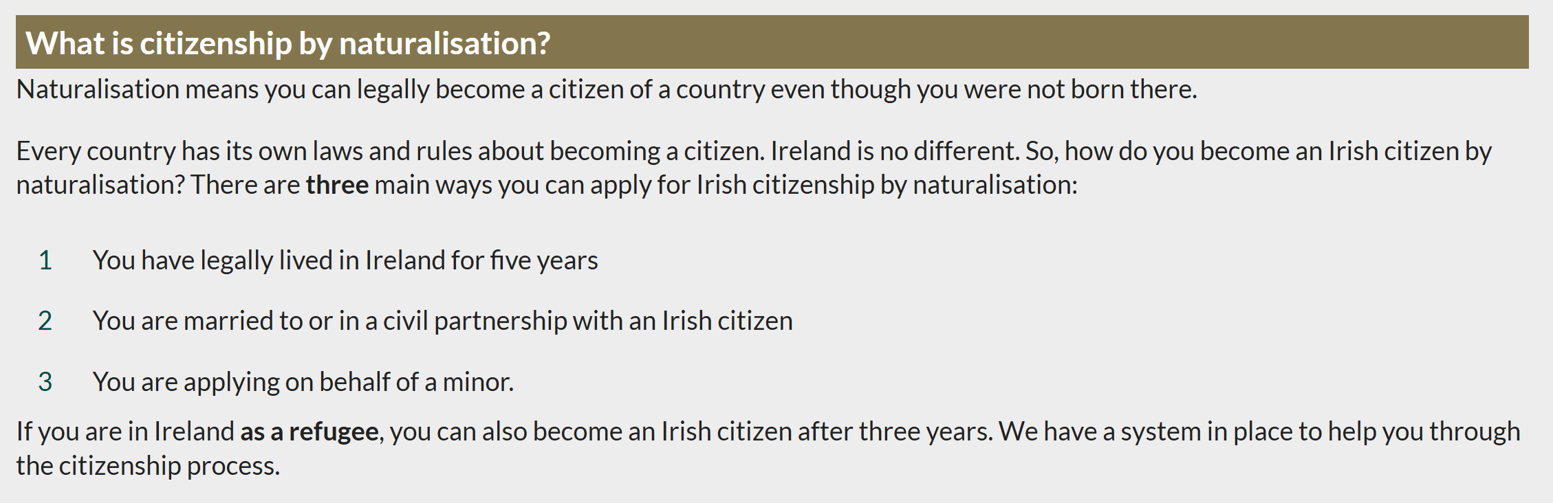 Ireland allows immigrants to naturalise and acquire citizenship after five years, however there is one key difference, Ireland allows refugees, including those who arrived illegally in Ireland, to obtain Irish citizenship in as little as three years, this is also backdated to the time they arrived in Ireland, not residence after the point at which they were granted refugee status.