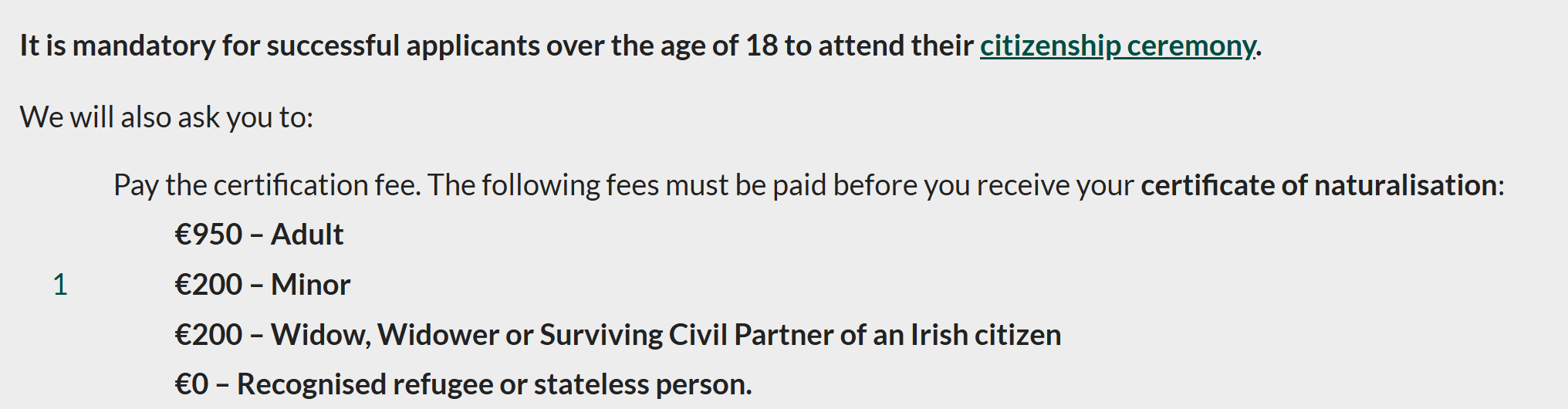 In Ireland, those with refugee status who want Irish citizenship only have to pay the citizenship application fee of €175, and while Ireland does charge €950 for a ceremony fee, this is waived if they have refugee status or are stateless, which many will be as they can renounce their citizenship or discard any documents upon their arrival.