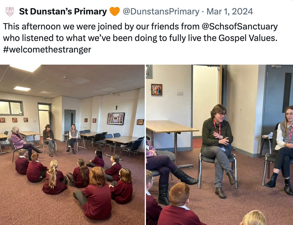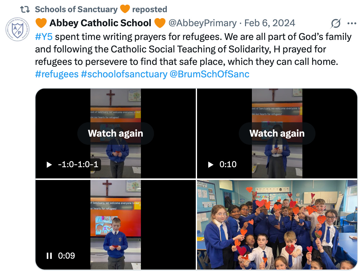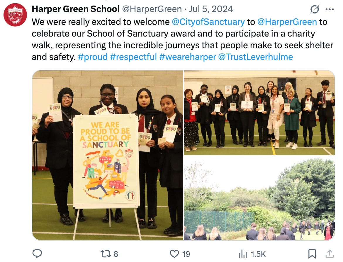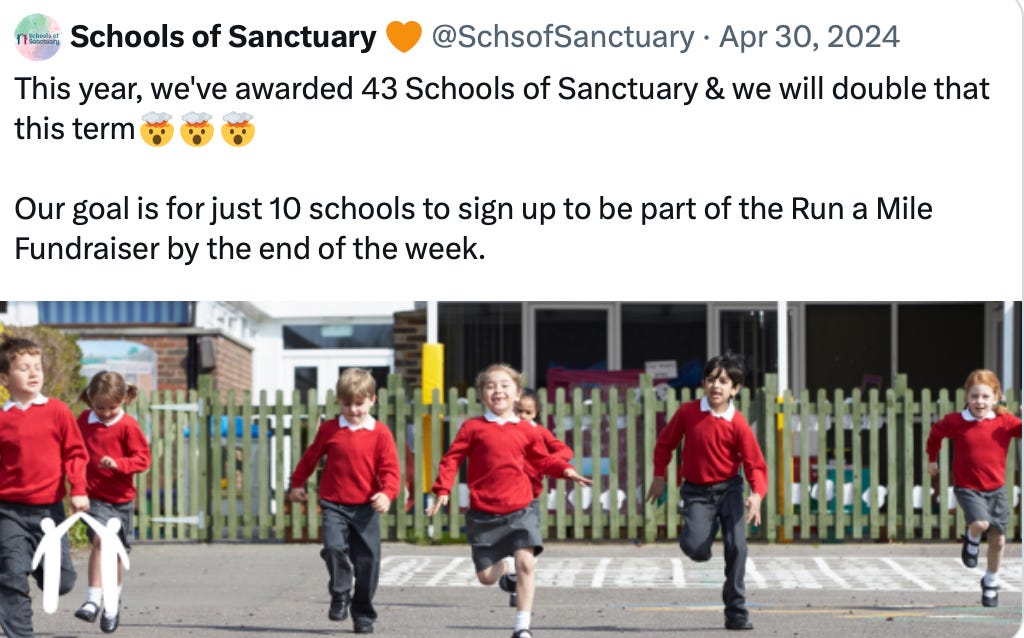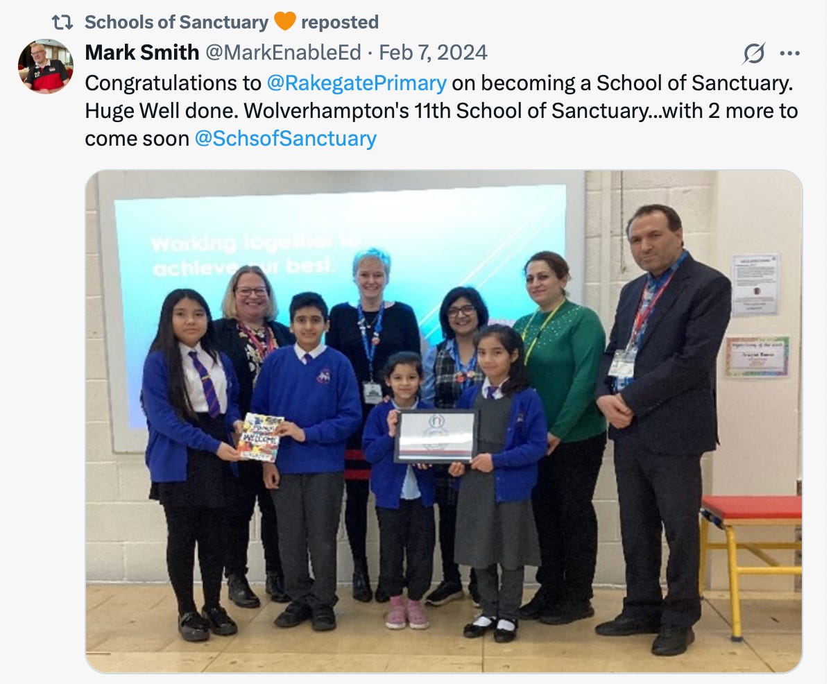 I am consistently being blocked on X as a result. “Schools of Sanctuary” is the latest to do this to my account: