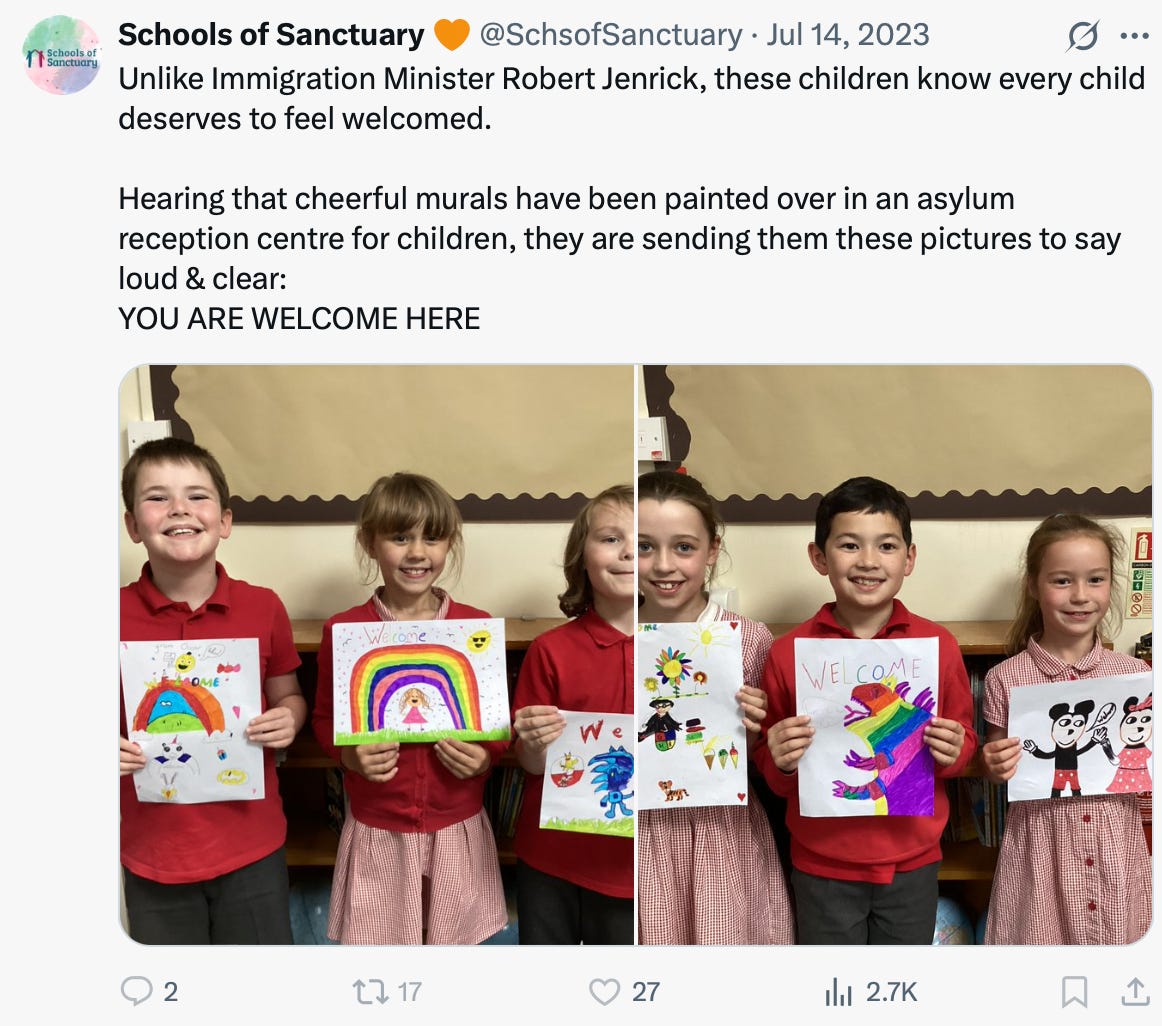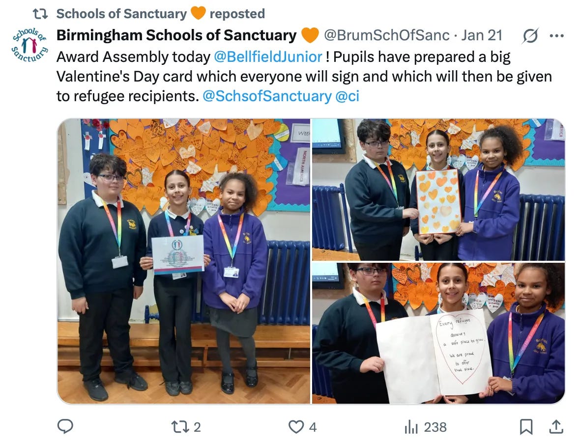 Affiliates of City of Sanctuary UK, however, live in a parallel universe – where small children are encouraged to send Valentine’s cards to new arrivals…