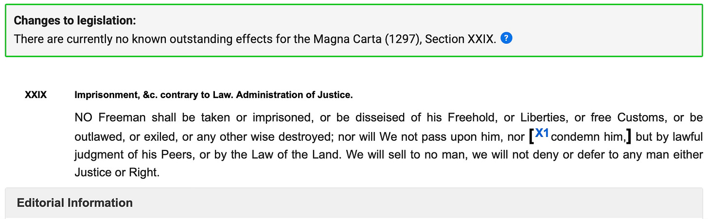 There are those who insist that Magna Carta 1215 is still in force because it is a Peace Treaty between the King and the Barons representing all free men and women and Parliament has not the power to remove it because Parliament did not exist in 1215. Here is Article 39 from Magna Carta 1215: