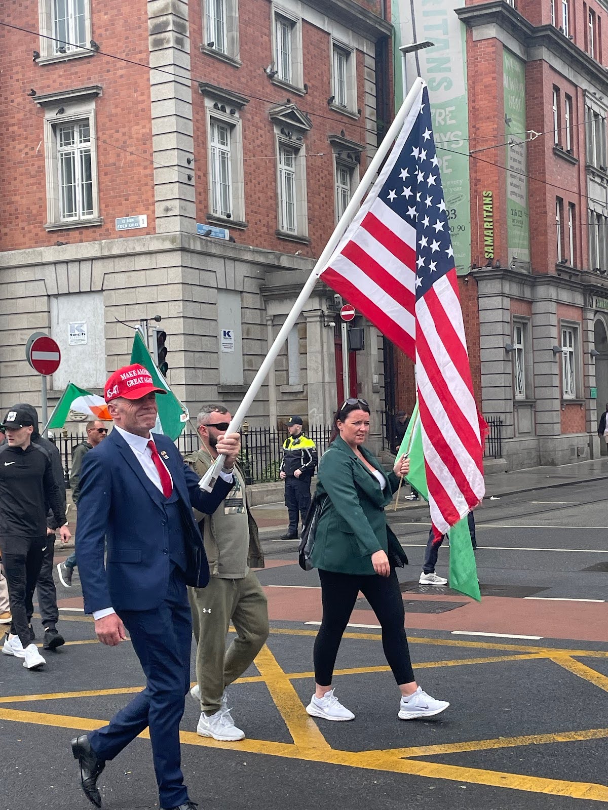 As I made my way to the Garden of Remembrance Irish tricolours were being handed out to attendees with Make Ireland Great Again (MIGA) hats worn by several hundred gathered.