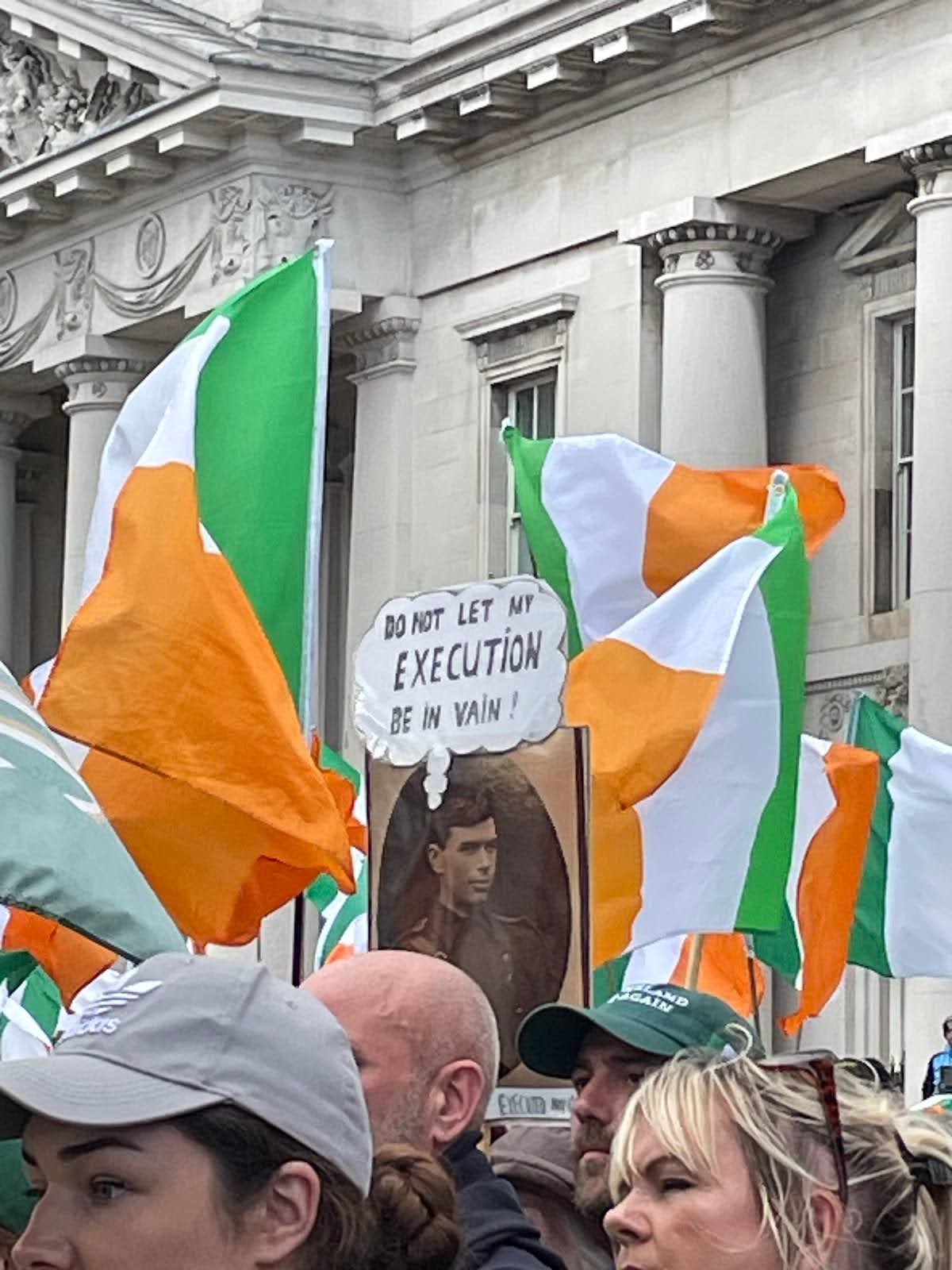 As the rally closed and the rain started to pour heavily, those gathered sang the Irish song Oro Se do bheatha bhaile which translates to “Oh you are welcome home” in English. Originally a Jacobite song to encourage the young pretender Bonnie Prince Charlie to come back to Ireland, it was later changed by the Irish revolutionary Patrick Pearse to welcome Grace O’Malley, a legendary Irish queen to save the Irish.