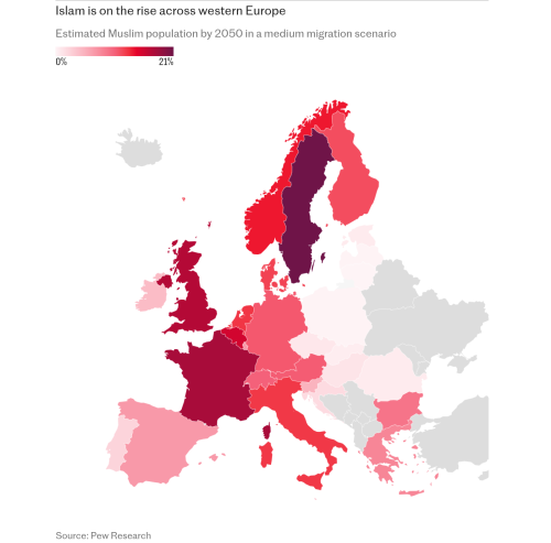 In 2017, the Pew Research Centre set out to forecast what Europe’s Muslim population would be in 2050. France, which deliberately restricts the collection of data on ethnicity and religion, is set to see somewhere between 13 per cent and 18 per cent of its residents follow Islam – the United Kingdom, somewhere between 10 per cent and 17 per cent. For the Continent as a whole, the figure was forecast to be between 7 per cent and 14 per cent – somewhere between a doubling and a tripling of the current level.