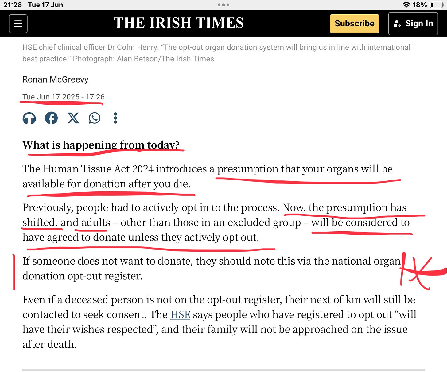 This article (MANDATORY IRISH ORGAN DONATION: Opt out NOW!) was created and published by Patrick E Walsh and is republished here under “Fair Use”