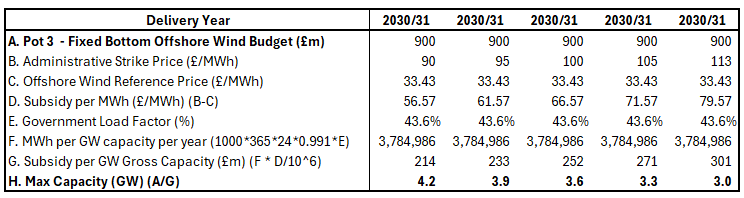 In the final delivery year of 2030/31, DESNZ expects the market reference price of fixed bottom offshore wind to fall to £33.43/MWh, meaning they expect it to receive more than twice as much – £79.57/MWh – as subsidy. Working through the arithmetic, each GW of nominal capacity would expect to receive £301m per year, so the budget will stretch to just under 3GW.