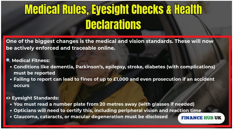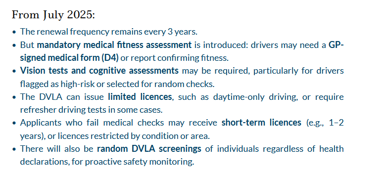 ‘From July 2025, the UK introduces its most significant reform in decades for drivers aged 70 and over. Until now, licence holders turned 70 and simply self‑certified their fitness to drive. That will change. The new regime introduces mandatory medical assessments, vision and potential cognitive screening, and risk‑based checks administered by the DVLA.’