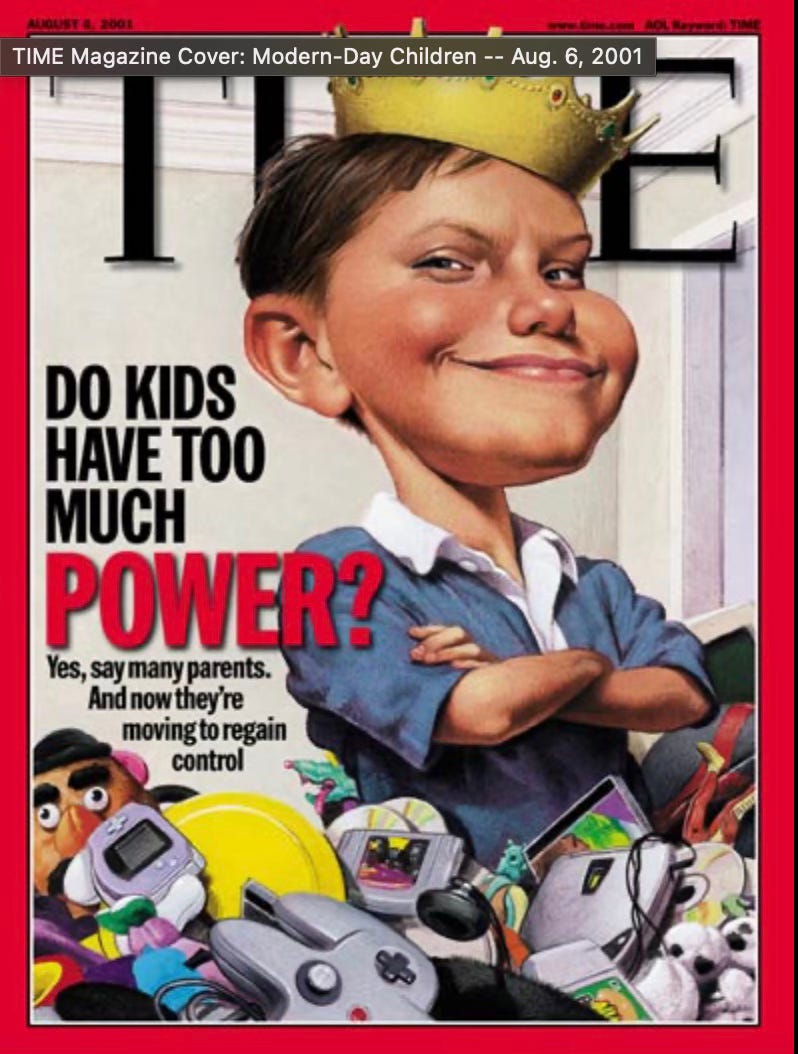 We’ve created a generation of parents who are literally afraid of their own children—afraid of their tantrums, their disappointment, their momentary unhappiness—and consequently, a generation of young adults who collapse at the first hint of discomfort, running to psychiatrists’ offices for diagnoses that medicalize what is fundamentally a failure of emotional development. This magazine cover is from 2001… the problem was recognized then and it’s been downhill ever since.