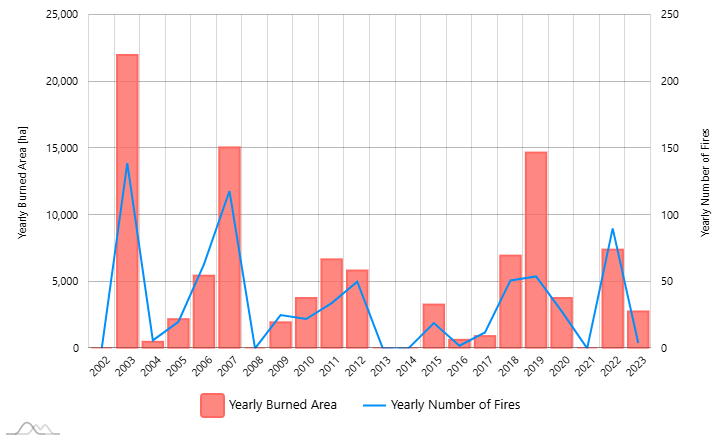 Chart of United Kingdom yearly burned area and number of fires from Copernicus.