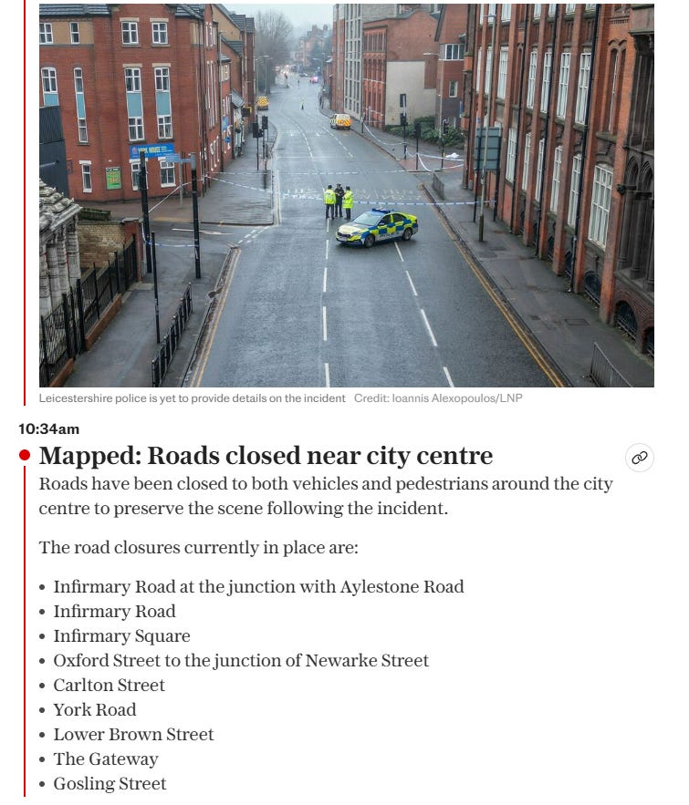 The incident, I learned from this, had been witnessed by students and staff. And – in case there was any doubt about this – it was a serious incident. A very serious one. Serious enough to affect entrance to Leicester Royal Infirmary. All very serious and incident-ish, as I’m sure you’ll agree.