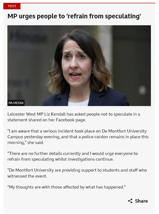 But we must refrain from speculating any further. Because in Britain in 2026, when a man stabs another man to death in the middle of a city centre in what would still have been daylight, one does not speculate about who they were, or why it happened, at all.