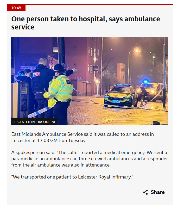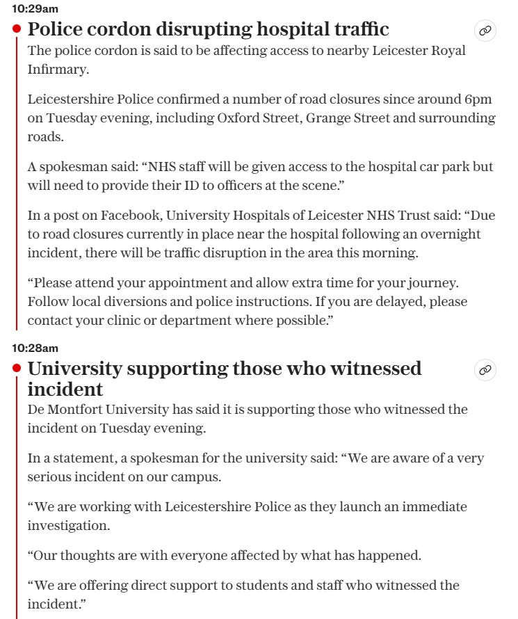 Aha! According to the BBC, a ‘person had been taken to hospital’ Now, that is a very serious incident. But what was that person taken to hospital for? Note the time provided. The incident had in fact happened at 5.03pm on Tuesday. It was now 11am on Wednesday. A person had been taken to hospital, which undoubtedly was very serious for them. But details had still yet to emerge, a mere 18 hours later. I scrolled down the BBC feed: