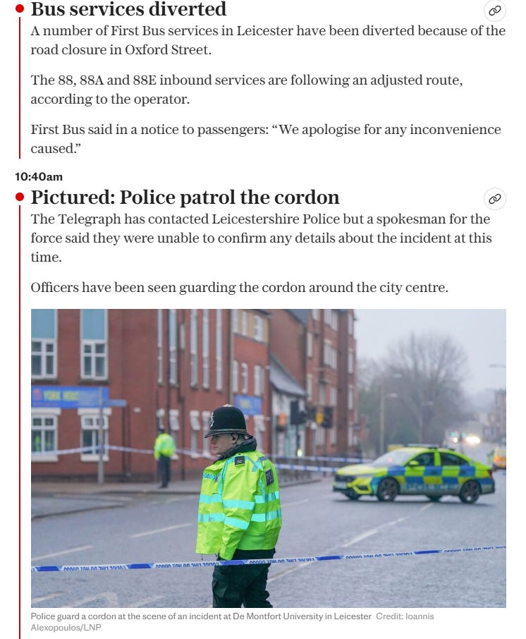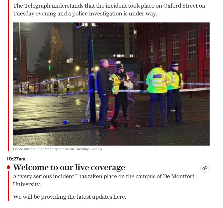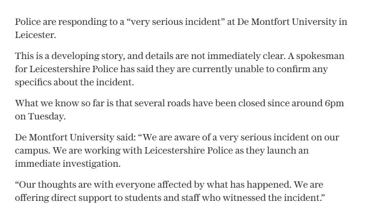 A funny thing happened yesterday morning. Checking the Telegraph website, I noticed a curious headline: there was a ‘very serious incident’ afoot at De Montfort University, in Leicester. Wondering what this serious incident was, and immediately forming some suspicions, as one does in times like these, I clicked on the headline and was taken to a live news update feed. Here is what I learned: