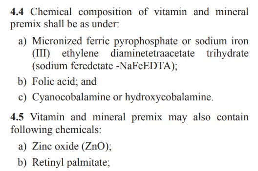 I then remembered that I learned that nearly all of the vitamin chemicals come from China and India, so I dug around India’s government website and found a document, authored by the government of India, outlining exactly which vitamins must be used to fortify white rice! This is a great find!