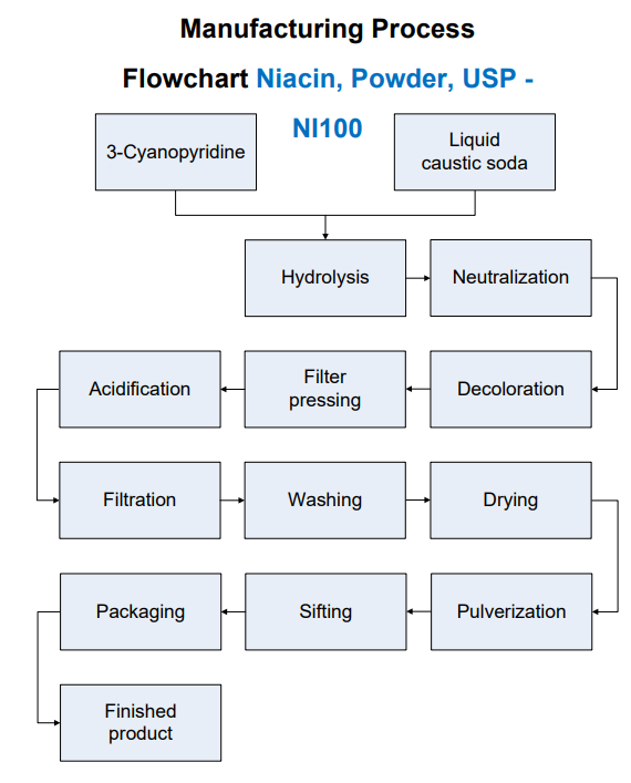 Here’s a flow chart showing how USP grade (meaning the cleanest of the cleanest, purest-ever, top shelf, super-premium) Niacin is made. This chart is provided by the company that makes it.