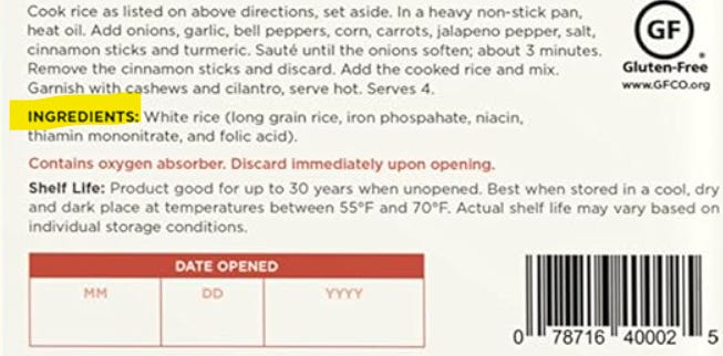 Then I saw a listing for a 25-pound container of Augason Farms Long Grain White Rice Emergency Food. Many years ago, when I was first waking up, the podcasters I was listening to had me terrified the world was about to end, so I had bought a lot of their tubs of products, put them in my storage area, and never looked at the ingredients. I assumed a tub of rice was a tub of rice, silly me!