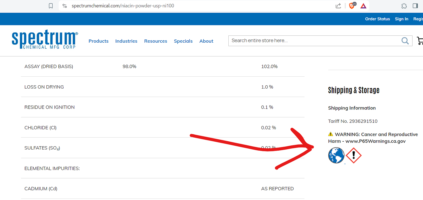 If you would like to learn more about 3-Cyanopyridine (one of the two starting ingredients to make Niacin), here’s the safety data sheet. You should send it to your favorite famous doctor who is peddling supplements containing niacin, then read their response, which will say the amount is so small it can’t hurt you, to which you should reply, “…but it’s pesticide…” then ask them if all insecticides are beneficial to human health or just this one.