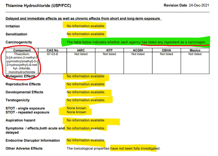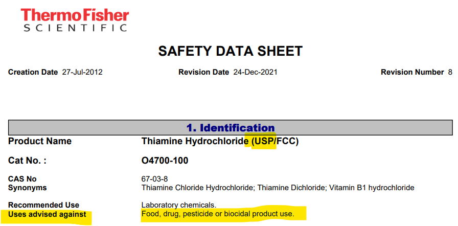 Here is the Manufacturer’s Safety Data Sheet for the best of the best of the absolute best “USP” pharmaceutical grade Thiamine Hydrochloride. Even though this is the USP grade, meaning it is as good as it gets, it is labeled as not being fit for consumption. And note, it doesn’t say “just have a little”, it says it is not for “food, drug, pesticide or biocidal use”.