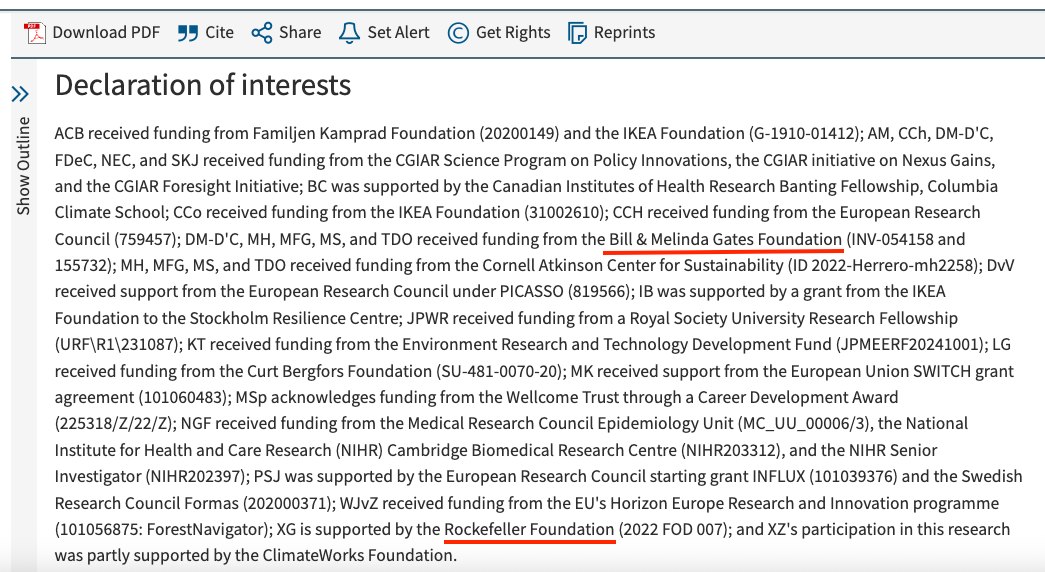 The paper’s declared funders include the Bill & Melinda Gates Foundation, the Rockefeller Foundation, Wellcome Trust, IKEA Foundation, and Children’s Investment Fund Foundation, whose grants financed the work through the EAT Foundation in Oslo.