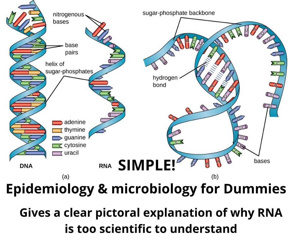 The famed book “Epidemiology and Microbiology for Dummies” has chipped in with some valuable help using pictorial explanations (see pic) that clearly show how RNA is too scientific fir dummies to understand so there are no excuses for the ignorant masses not returning to their carefully installed hypnotic trance once the word “RNA” is uttered.
