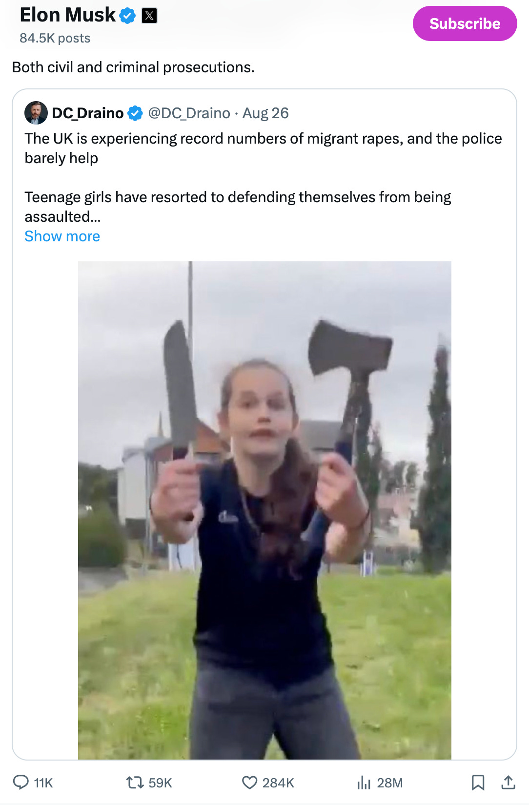 Elon Musk took to twitter to once again call for prosecutions for those responsible for the grooming gang coverup. The implication being that the Dundee Girl was obliged to defend herself and her sister in a nation where the state no longer protects her, only for her to be arrested and prosecuted by those she trusted to protect her.