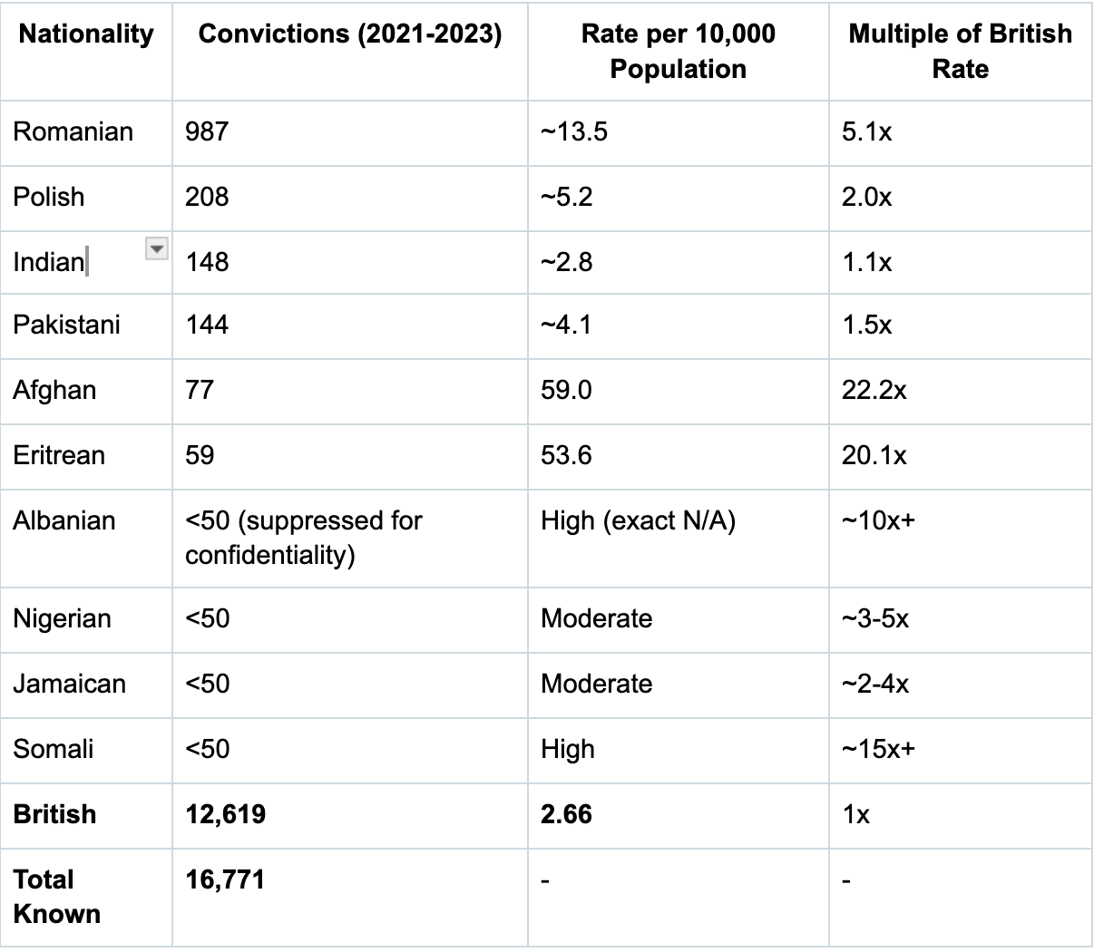 - Source Notes: MoJ data via Centre for Migration Control FOI (2025). 87 nationalities had higher rates than British; top 25 received 52,486 long-term visas in 2024. For 2024 specifics, Romanians (27), Poles (27), Indians (38 for assaults), Pakistanis (20), and Afghans (19 for assaults) led in sub-categories like sexual assault on females.