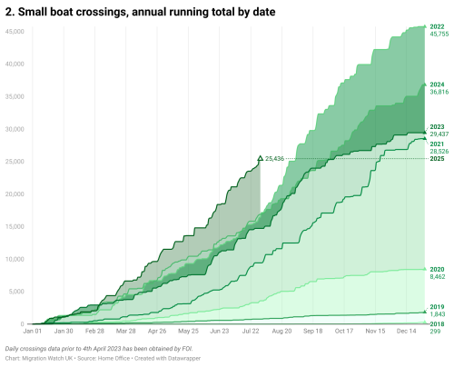 Small boat crossings continued to rise, with numbers running almost a month ahead of where we were in the worst year to date (2022). Let’s see if Starmer’s deal has any impact over the next week!