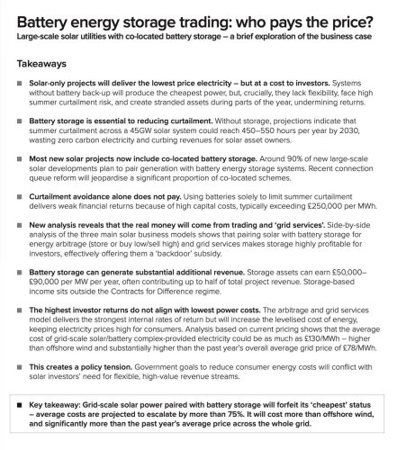A new report by a leading renewable energy policy expert reveals that the UK’s rapid expansion of large-scale solar farms could drive electricity prices even higher once the hidden costs and market incentives around battery storage are taken into account.