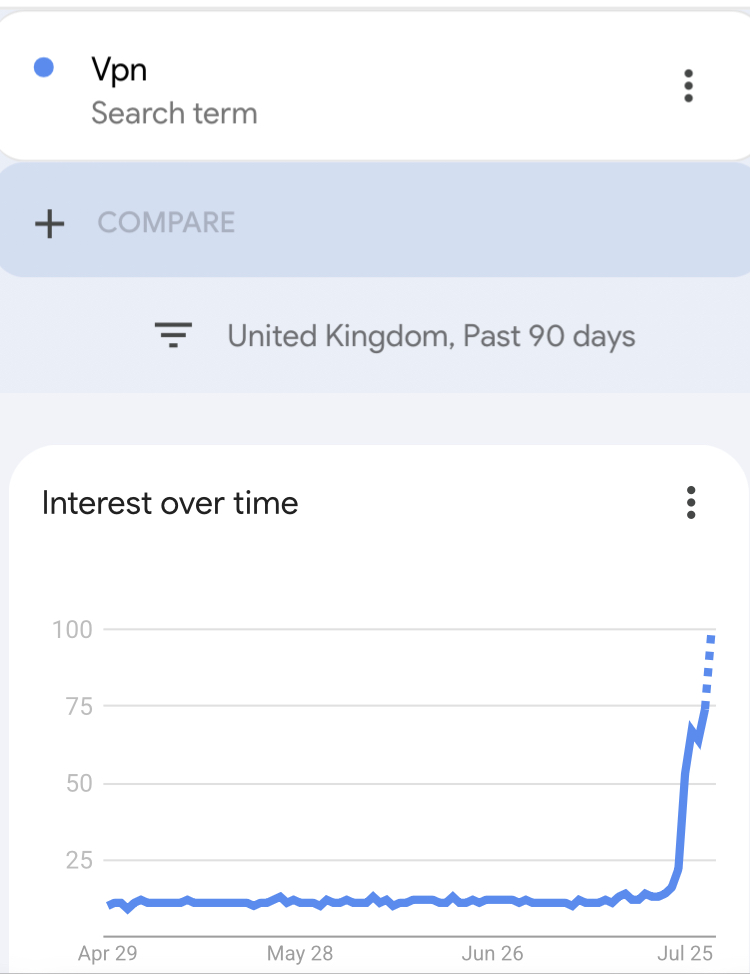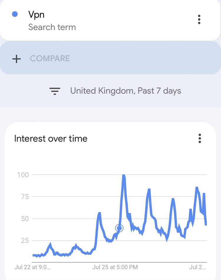The result is a surge in interest in Virtual Private Networks (VPNs) which allow internet users to access websites as if they were in a less censorious country. Half of the top ten free apps in Apple’s app download charts yesterday were for VPNs. Google Trends data show that searches for “VPN” have gone through the roof since Friday. Readers can draw their own conclusions from the fact that these searches have been peaking between midnight and 2am.