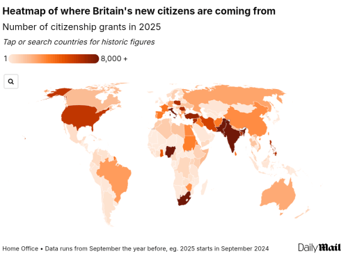 Last year, migrants from more than 200 countries – including Nepal, North Korea and Fiji – were rubber-stamped as British in the year ending September 2025.