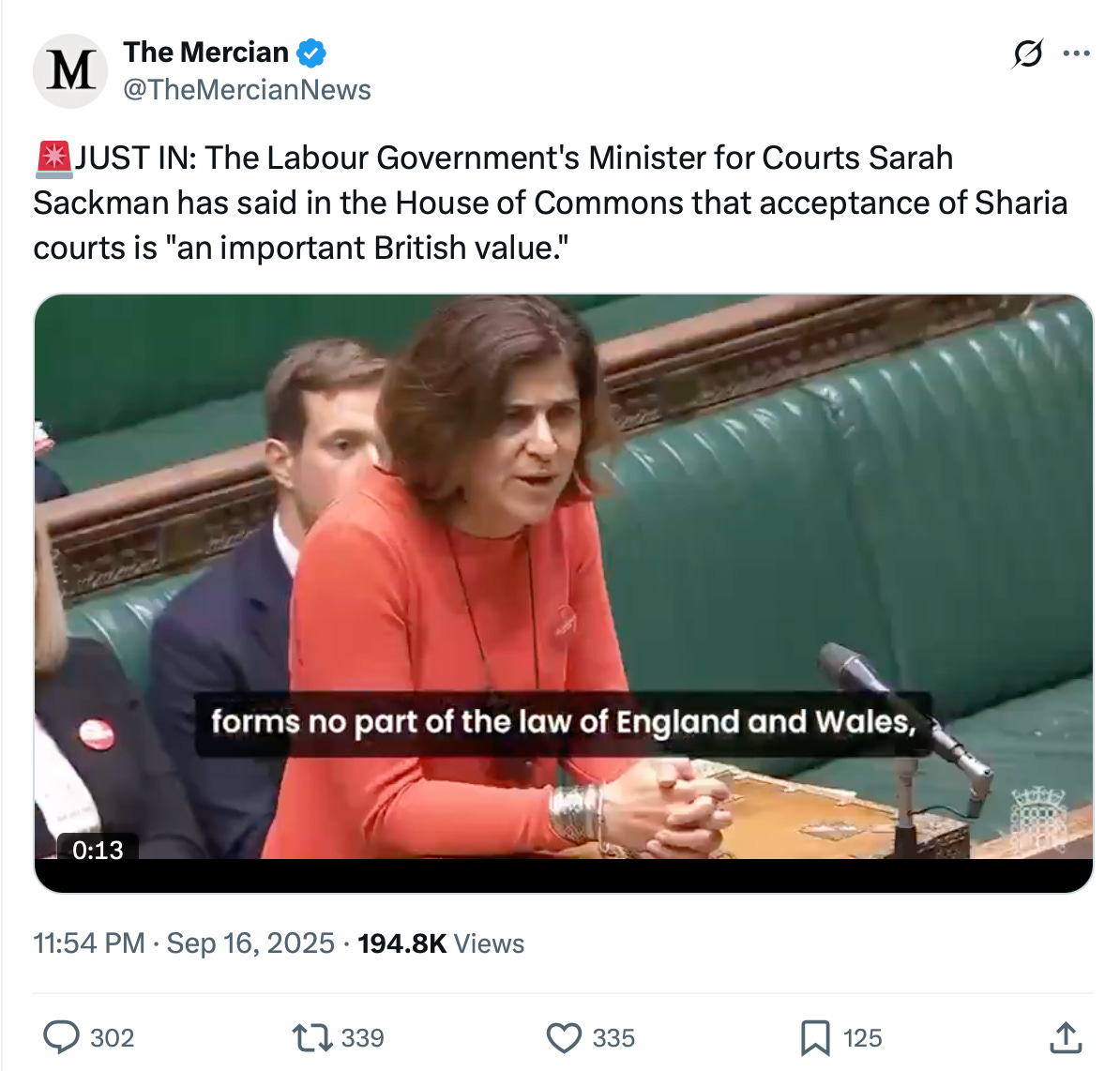 This political double-shuffle on behalf of the authorities – refusing either to regulate or to ban – played out in plain sight two weeks ago in Parliament. Reform UK MP, Sarah Pochin, asked the Secretary of State for Courts, Sarah Sackman, whether she recognised Sharia law and Sharia courts in the United Kingdom. Sackman replied with a straight face: