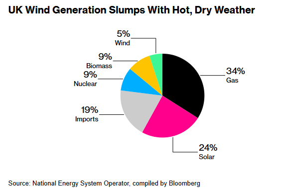 The first story, “UK Heat Wave Cuts Wind Output, Exposing Power Supply Gaps”