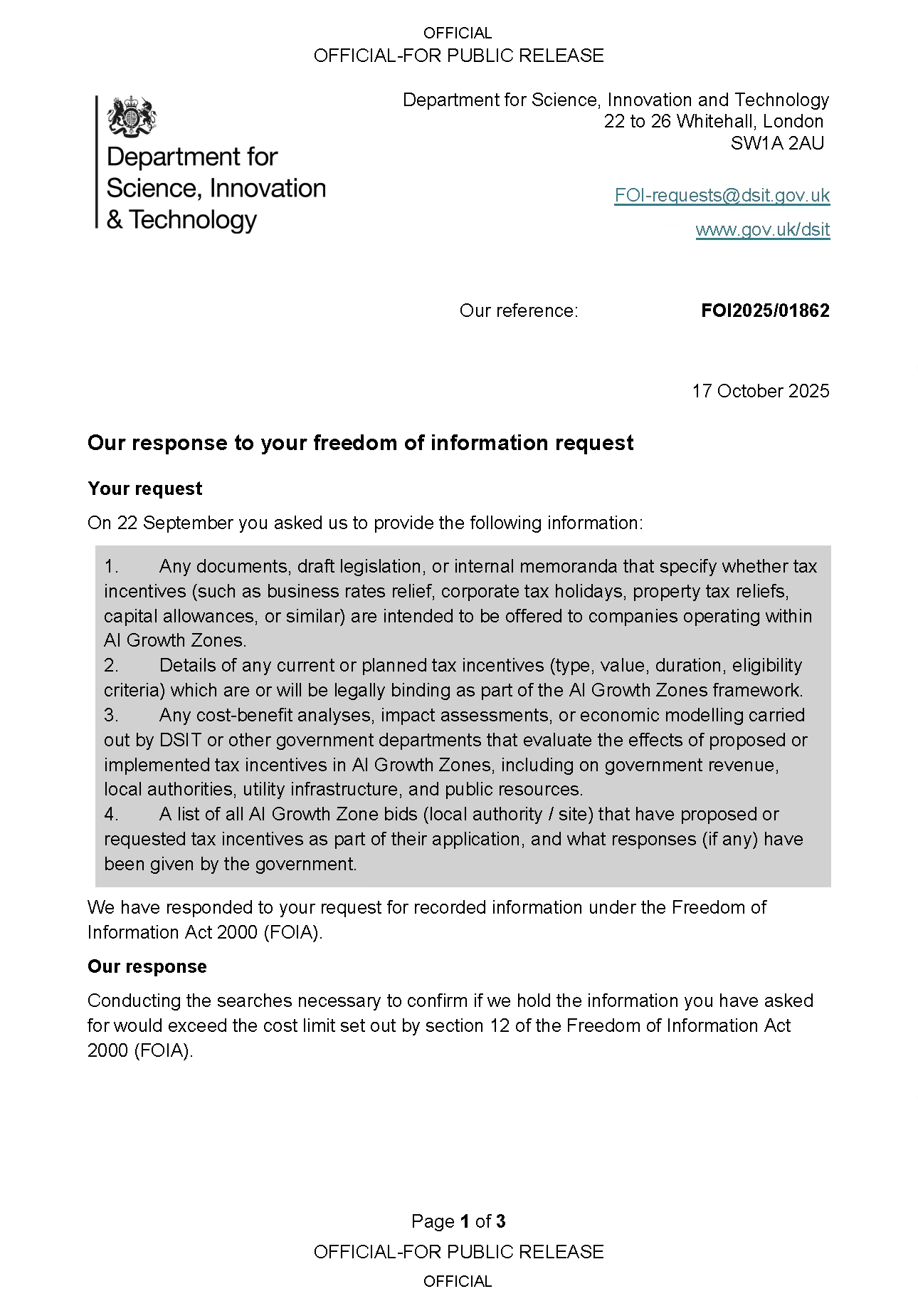 The Department for Science, Innovation and Technology (DSIT) refusal to answer my FOI is particularly telling. In a properly functioning democracy, basic questions about tax incentives for major infrastructure policy should be trivially easy to answer. The Section 12 claim suggests either: