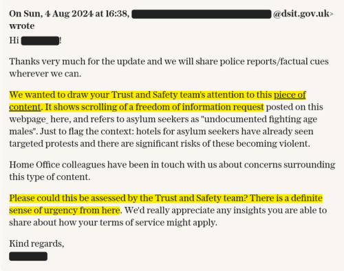 Emails repeatedly asked platforms to intervene on content that shaped narratives around immigration, asylum seekers, or police treatment. These requests did not simply target slurs or direct incitement but rather extended to content that officials feared might “mislead the reader” or “further a sense of division.”