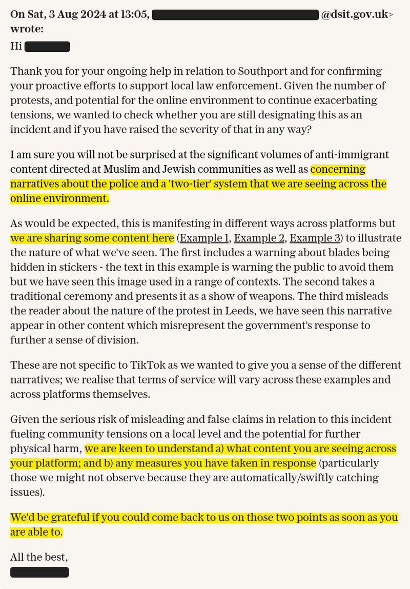 Officials were asking for direct intervention. One message requested clarity from platforms about “what content you are seeing across your platform; and b) any measures you have taken in response.” A follow-up email urged platforms to act quickly, stating, “We’d be grateful if you could come back to us on those two points as soon as you are able to.”