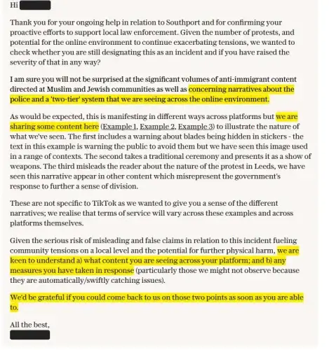 The body, now known as the National Security and Online Information Team (NSOIT) has been lobbying social media companies such as TikTok to take action against users who post what it describes as “concerning narratives” about immigration and ‘two tier policing’.