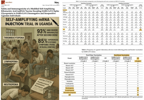 In a Phase 1 trial conducted in Uganda, Kitonsa et al tested a covid-19 replicon samRNA injection encoding the spike protein in 42 healthy adults. The findings were deeply concerning: A total of 39 Grade 3 or higher laboratory abnormality adverse events occurred after the second dose – equivalent to 93% of the trial’s participants.