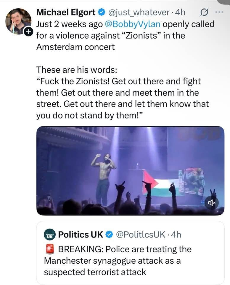 The fact is that every pro Palestinian march the UK has allowed, has been an anti Jewish march. It’s been a movement based on excusing and ignoring Palestinian terrorism towards Israeli Jews. Every one of those the government and police have allowed, has increased antisemitism in the UK. And the same applies to the incredibly weak and complacently indulgent responses to direct calls to violence, terrorism and Jew hatred from leftist music bands like Kneecap and Bob Vylan. At the Glastonbury festival in June these performers openly supported terrorism (as they have on multiple other occasions). The BBC broadcast it. Bob Vylan called for terrorist murders of the IDF. More recently, in Amsterdam, the band led chants calling for death to “Zionists”, which has become a common extreme leftist and Muslim jihadist code for calling for death to Jews.