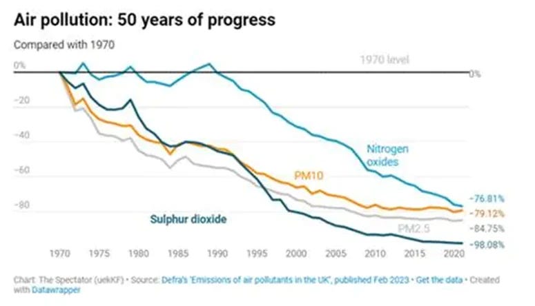 London’s air has improved dramatically over decades, thanks to a combination of deindustrialisation, cleaner fuels and better internal combustion engines – not Khan’s cash-grab. DEFRA data shows pollutants such as nitrogen oxides, sulphur dioxide, PM10 and PM2.5 since 1970 plunging, rendering Ulez’s marginal impact invisible amid given trends.